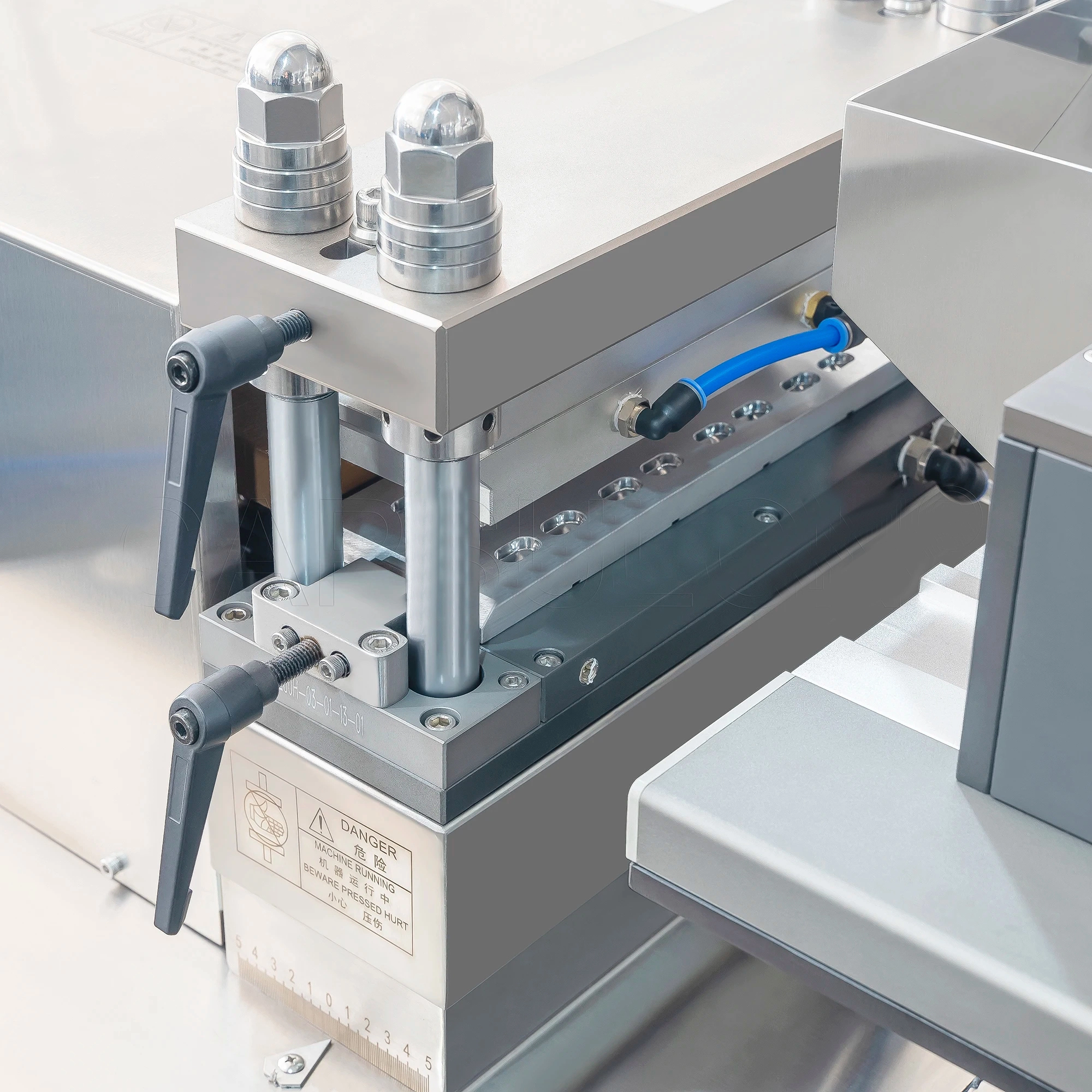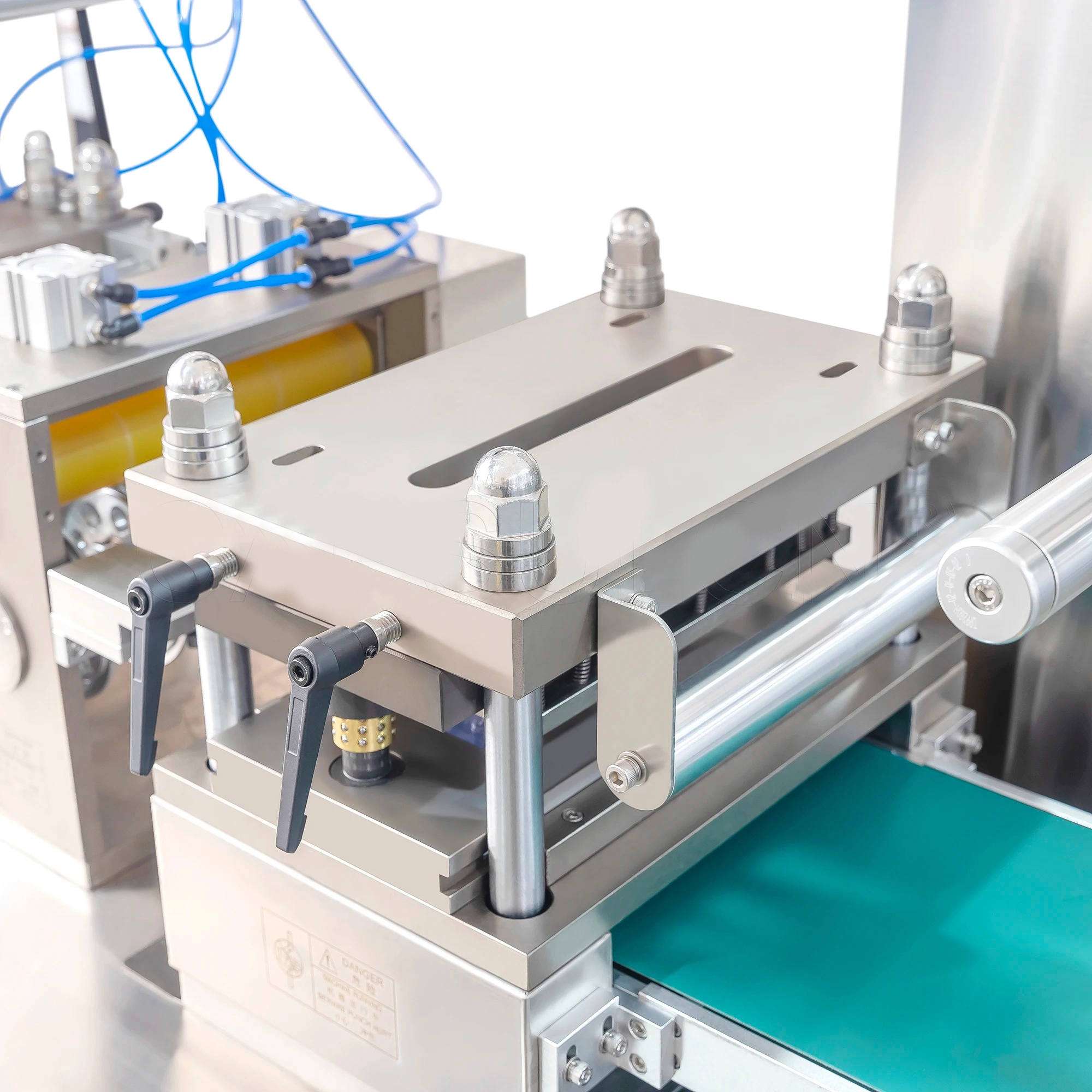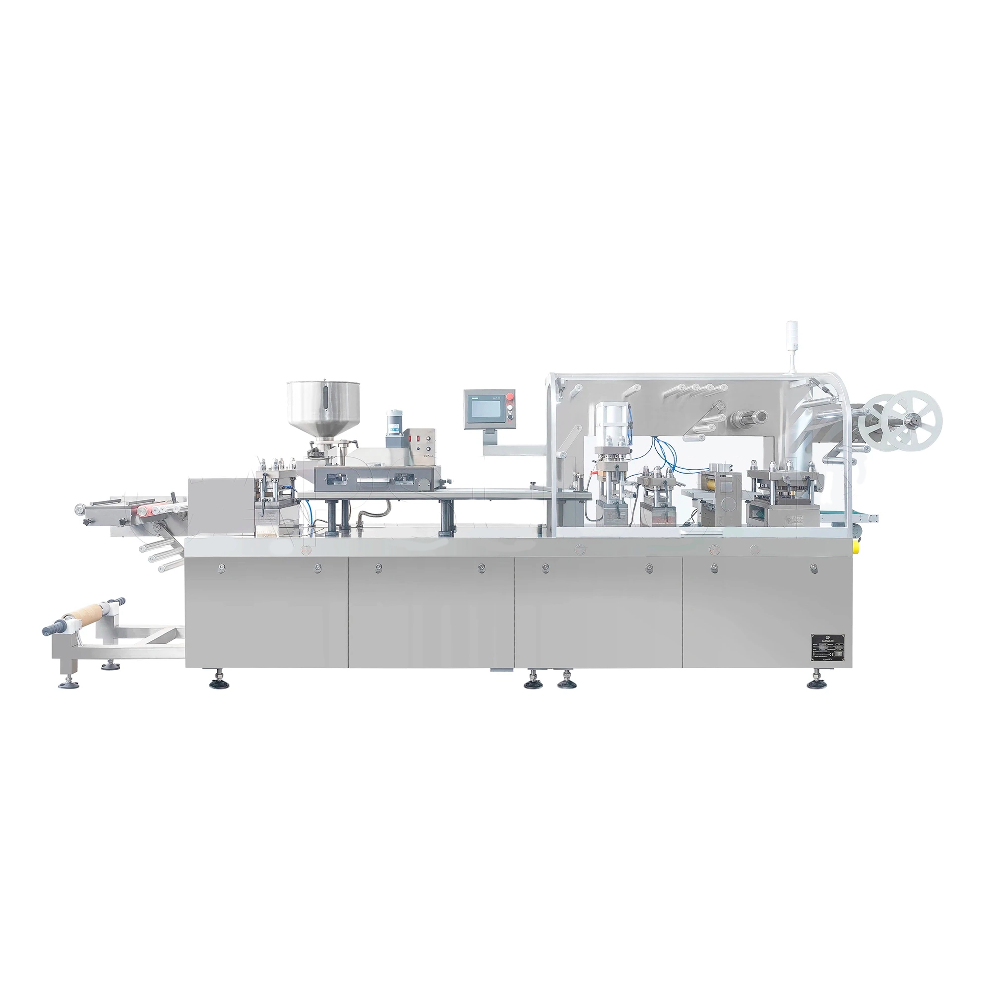 تشكيل الفقاعات البلاستيكية، وملء المواد تلقائيًا، والضغط المسطح لرقائق الألومنيوم PTP والختم الحراري، والمحاذاة الرسومية، وطباعة رقم الدفعة، والضغط على خط التمزيق، وثقب لوحة الدواء، واستعادة النفايات.