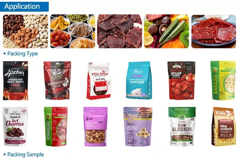 آلة تعبئة لحم البقر المجفف بيلتونج الأوتوماتيكية بأكياس بسحاب مناسبة لمجموعة واسعة من المنتجات، بما في ذلك لحم البقر المجفف، بيلتونج، الفواكه المجففة، المكسرات، مخاليط الوجبات الخفيفة، الجرانولا، ألواح البروتين، مكافآت الحيوانات الأليفة، القهوة، الشاي، والتوابل المطحونة. تصميمها متعدد الاستخدامات يجعلها مثالية للعديد من الوجبات الخفيفة ومنتجات الأطعمة التي تتطلب تغليفًا آمنًا وواقفًا.
