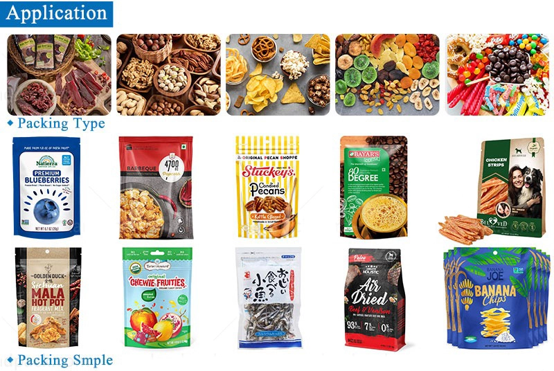 It is widely used For lots of application such as grain, stick, slice, globose, irregular shape products such as beef jerky, biltong, dried meat, candy, chocolate, jelly, pasta, melon seeds, roasted seeds, peanuts, pistachios, almonds, cashews, nuts, coffee bean, chips ,raisins, plum, cereals and other leisure foods, pet food, puffed food, vegetable, dehydrated vegetables ,fruits, sea food, frozen food, small hardware, etc.