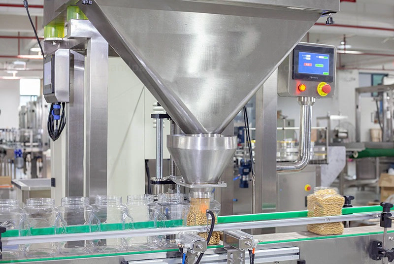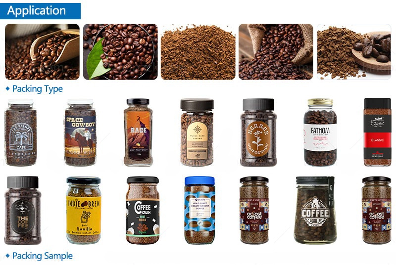 آلة تعبئة وتغليف زجاجات حبيبية مربعة الشكل مناسبة لتعبئة العديد من المنتجات الحبيبية، مثل المكسرات وحبوب البن والفول السوداني والحلوى والبذور ورقائق البطاطس والفشار واللوز والفواكه المجففة وسلطة الخضار والأطعمة المجمدة والبسكويت والشوكولاتة والبندق والذرة وأطعمة الحيوانات الأليفة، إلخ.