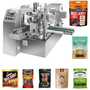 تم تصميم آلة تعبئة الأكياس الجاهزة الأوتوماتيكية هذه خصيصًا لتغليف لحوم البقر المجففة بكفاءة. وهي تقوم بسلسلة كاملة من الإجراءات بما في ذلك نقل الأكياس ووزنها وملؤها وختمها. وهي مزودة بنظام تحكم PLC وواجهة شاشة تعمل باللمس سهلة الاستخدام، وتوفر سرعة قابلة للتعديل ودقة عالية. وتتميز بالكشف التلقائي عن الأخطاء مثل “لا يوجد كيس” أو “الكيس غير مفتوح” أو “خطأ في الختم”، مما يقلل من النفايات ويعزز الكفاءة.