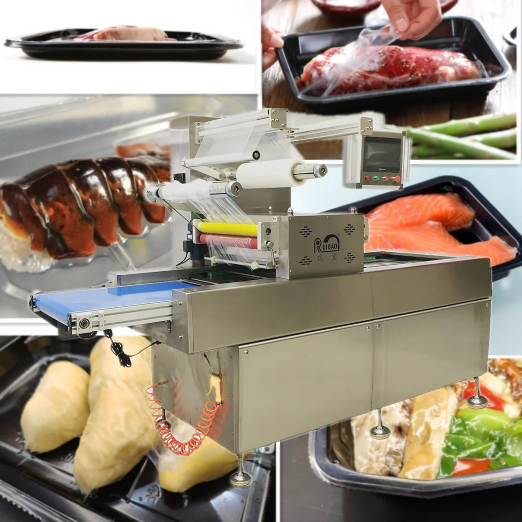 آلة تعبئة وتغليف الجلد المفرغ من الهواء أوتوماتيكيًا، آلة غلق صواني الوجبات السريعة، آلة تعبئة اللحوم الطازجة المفرغة من الهواء، آلة تعبئة جلد السمك