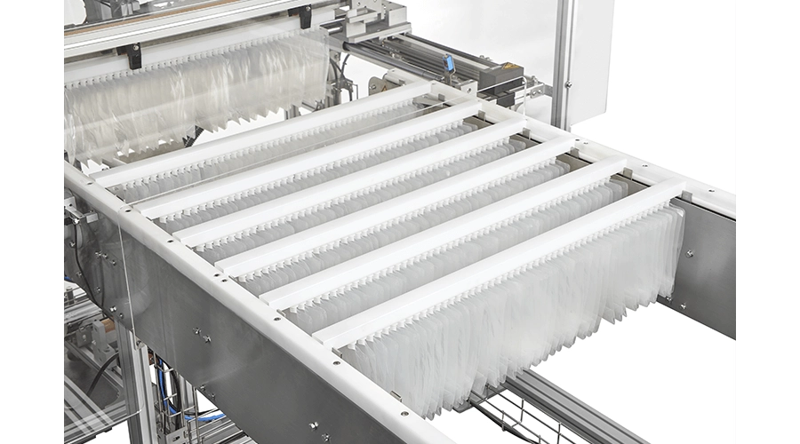 يقوم مسار ضبط الأكياس متعدد المسارات بنقل الأكياس تلقائيًا إلى آلية إدخال الأكياس، وفي نفس الوقت، يدفع الذراع إلى حوض التجميع.