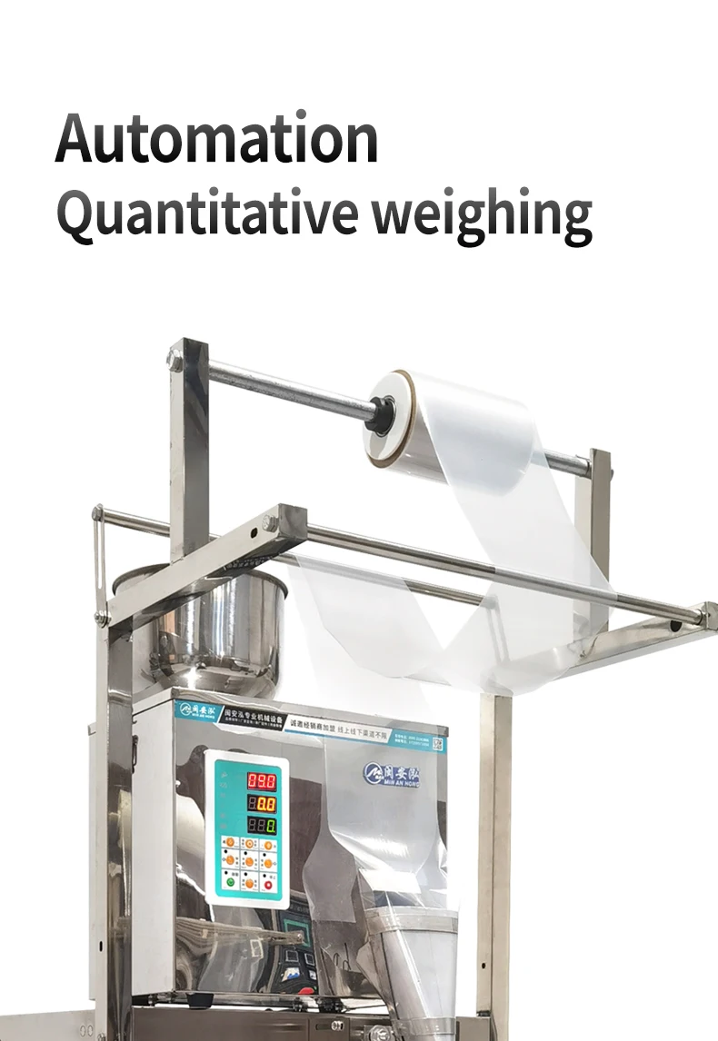 يمكن إجراء جميع أعمال صنع الأكياس والوزن والملء والختم والقطع تلقائيًا بواسطة هذه الآلة.