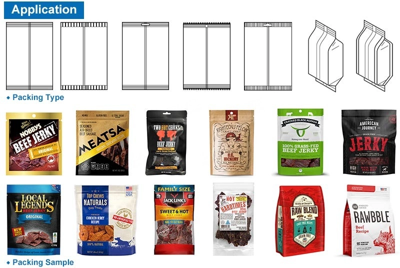 آلة تعبئة الأكياس الدوارة الأوتوماتيكية من لحم البقر المتشنج مع ميزان متعدد الرؤوس مناسبة لجميع أنواع الحبوب والمواد الصلبة، مثل لحم البقر المقدد، المتشنج، البيلتونج، الحلوى، المكسرات، الزبيب، الفول السوداني، بذور البطيخ، المكسرات، الجوز، الشوكولاتة، الفواكه المحفوظة، رقائق البطاطس، وأغذية الحيوانات الأليفة، والأغذية المتوسعة، وما إلى ذلك.