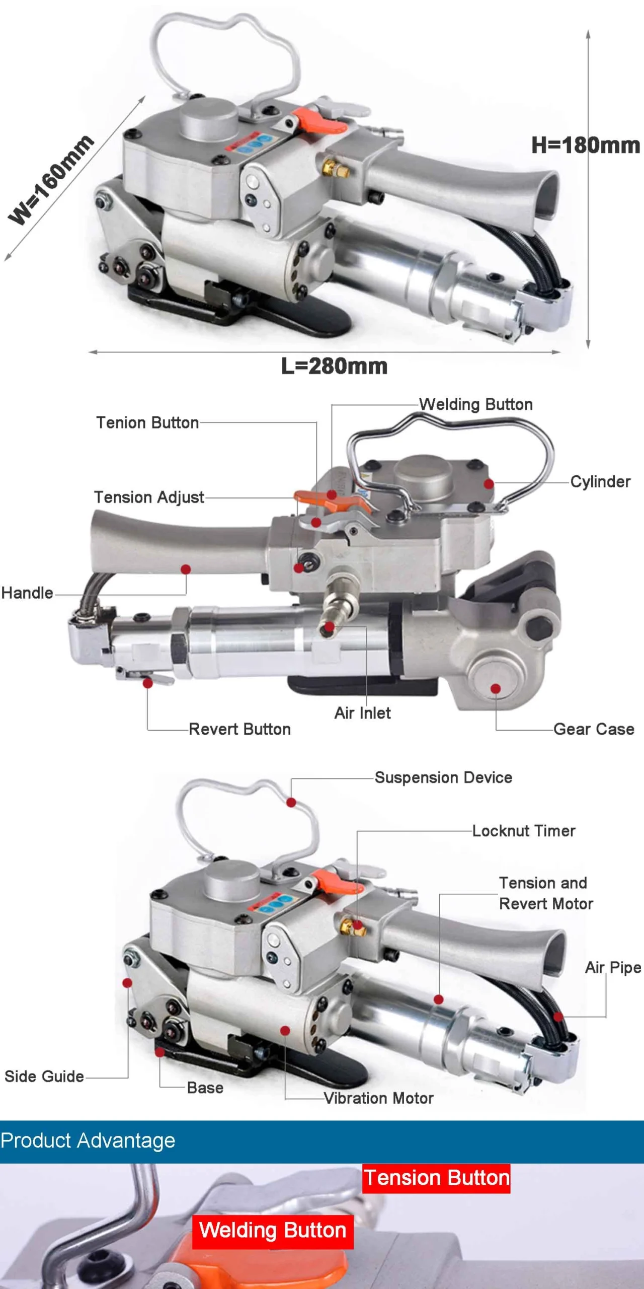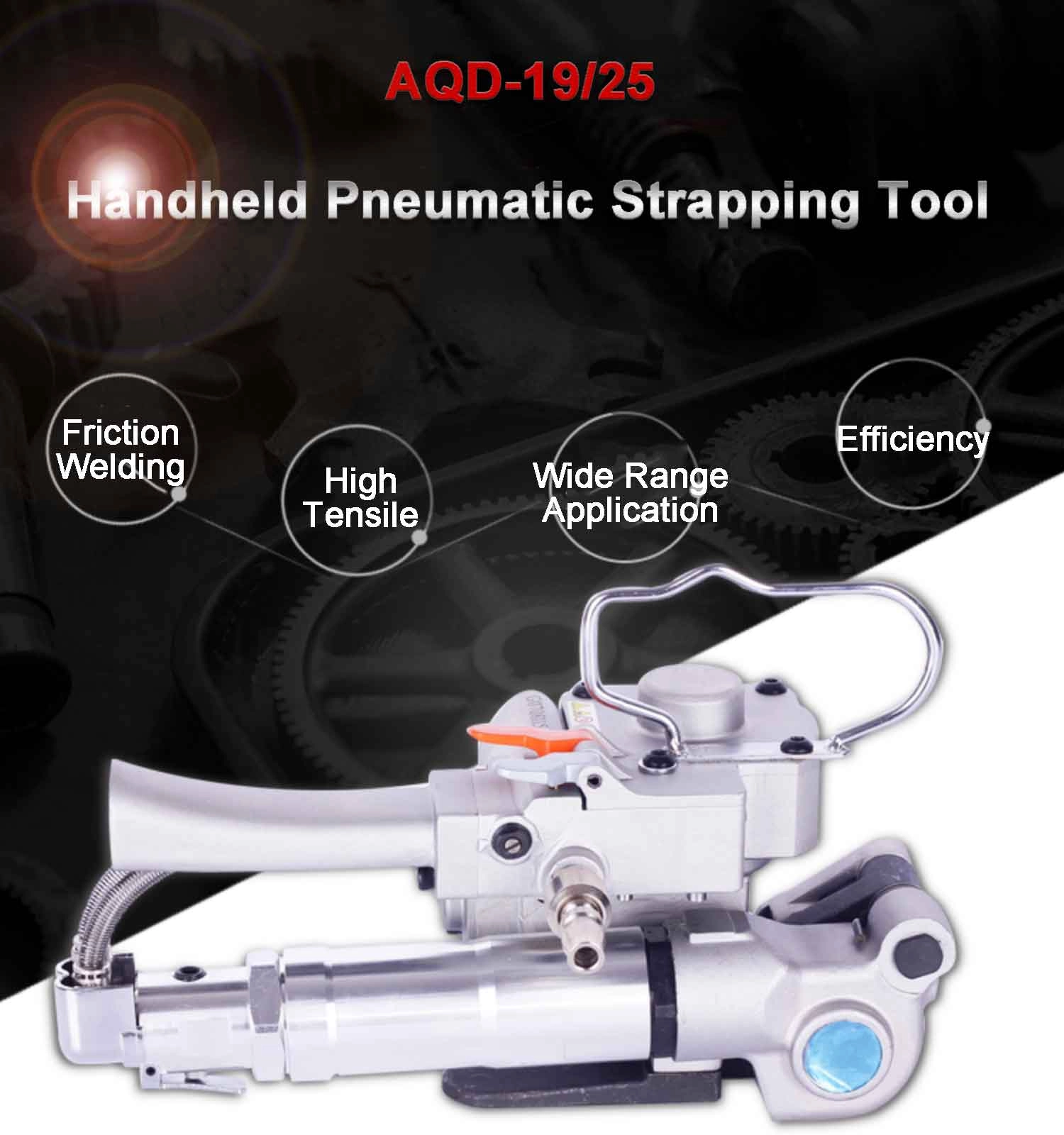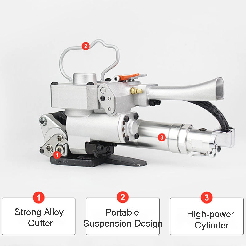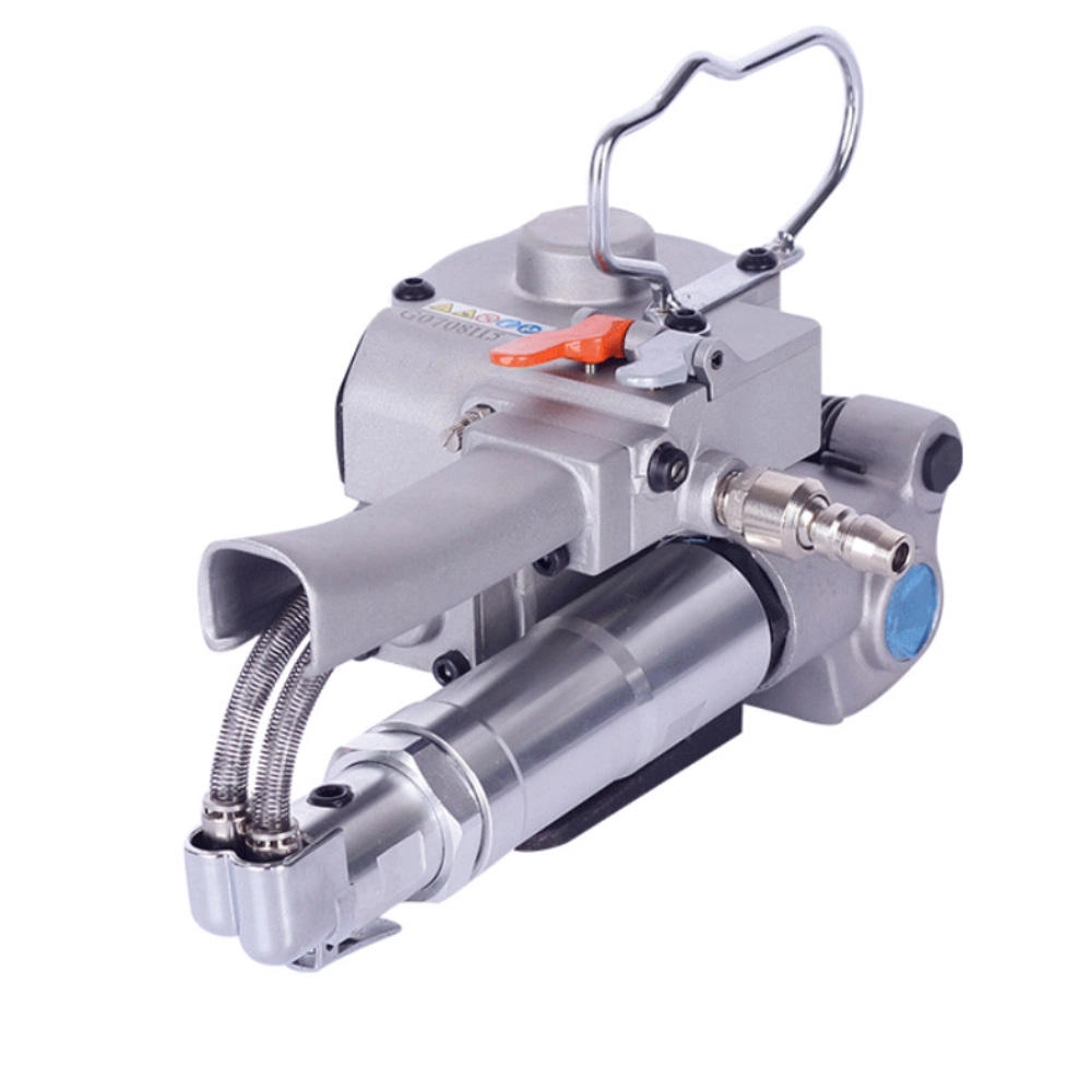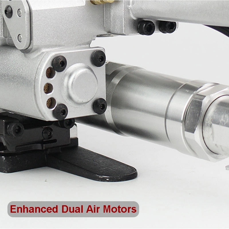 تتمكن أداة الربط الهوائية من إتمام خطوة الشد واللحام في آلة واحدة. يتم تشغيلها بالهواء بدلاً من التشغيل اليدوي. وبالمقارنة بأداة الربط اليدوية، فإنها تعمل على تحسين كفاءة التعبئة بشكل كبير. وهي تستخدم الآن على نطاق واسع في صناعات مثل الطوب والزجاج والورق وسبائك الألومنيوم والأنابيب المعدنية وما إلى ذلك.