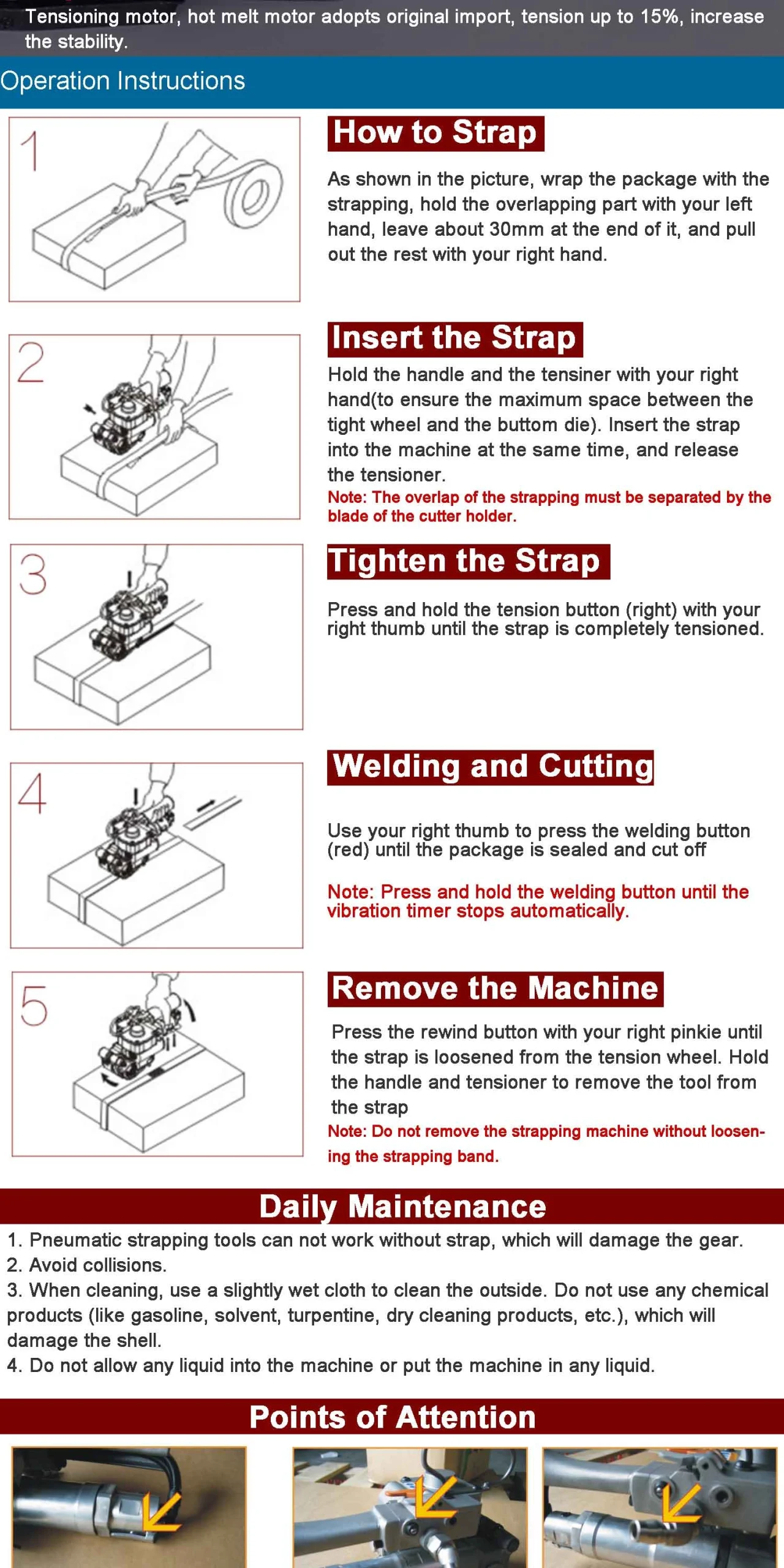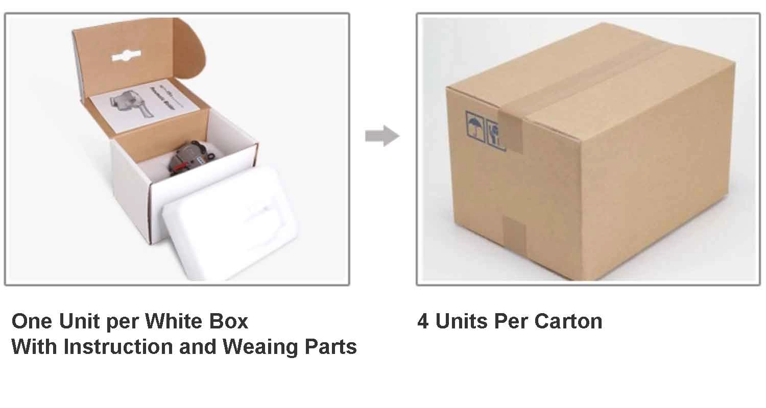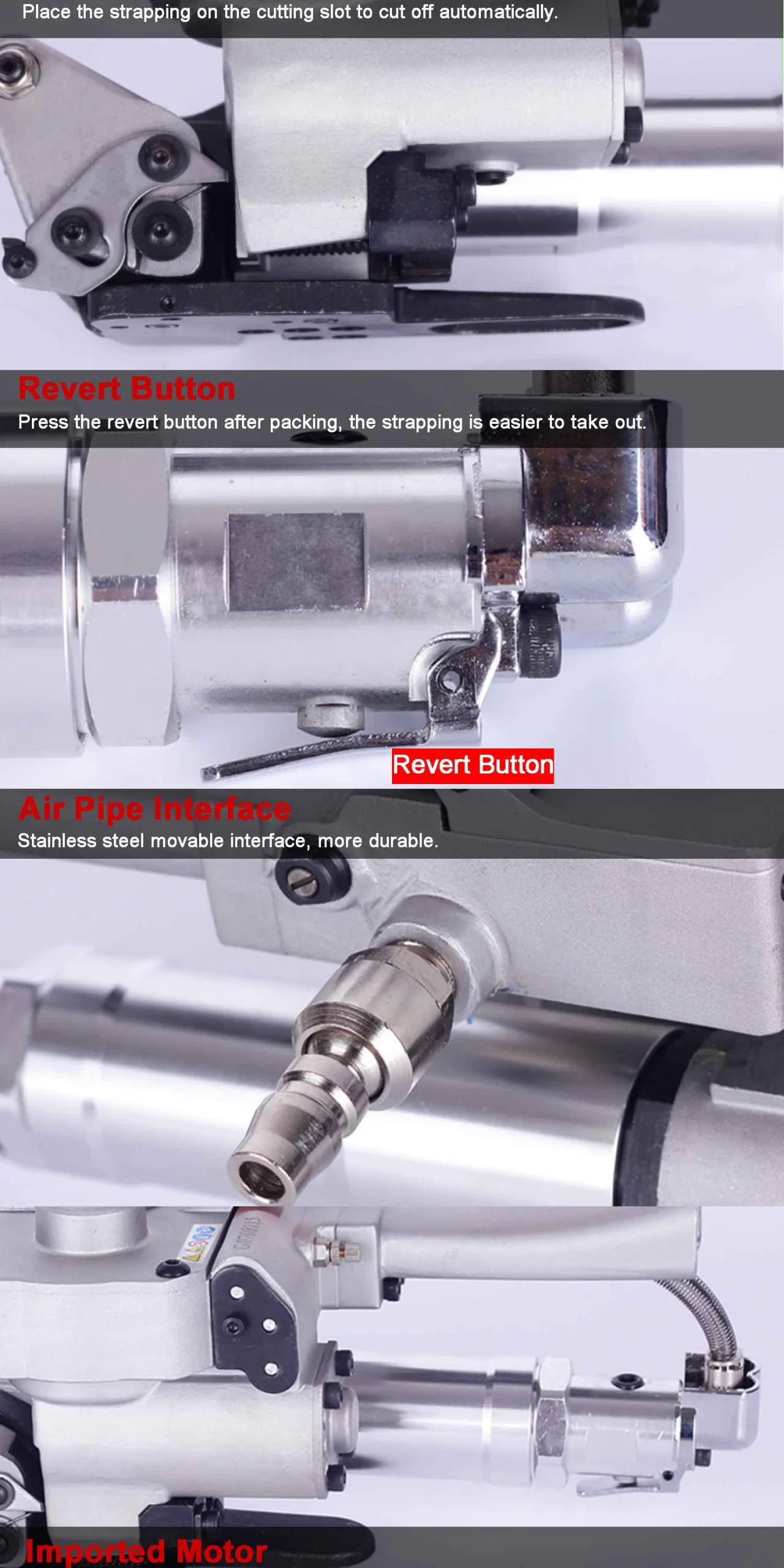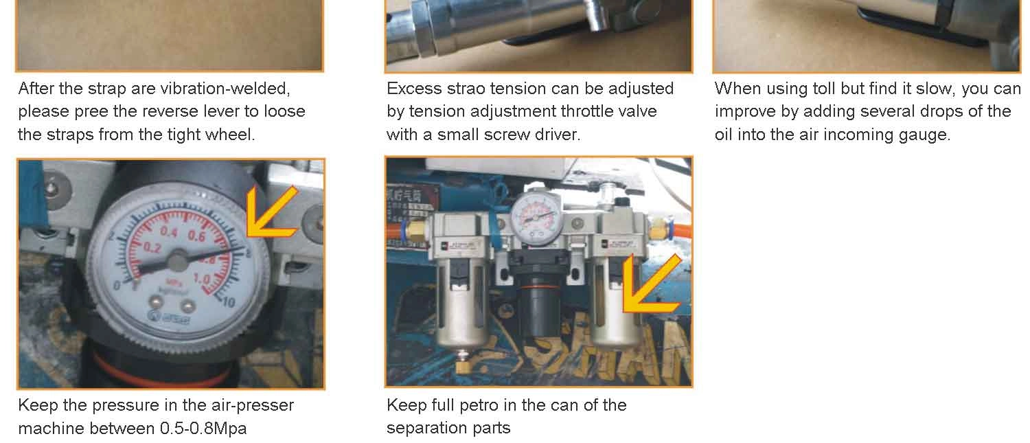 تتمكن أداة الربط الهوائية من إتمام خطوة الشد واللحام في آلة واحدة. يتم تشغيلها بالهواء بدلاً من التشغيل اليدوي. وبالمقارنة بأداة الربط اليدوية، فإنها تعمل على تحسين كفاءة التعبئة بشكل كبير. وهي تستخدم الآن على نطاق واسع في صناعات مثل الطوب والزجاج والورق وسبائك الألومنيوم والأنابيب المعدنية وما إلى ذلك.