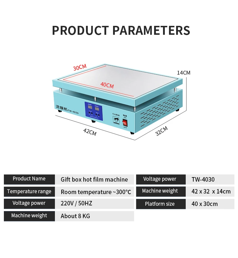 تُستخدم آلة كي الفيلم ذات درجة الحرارة الثابتة متعددة الوظائف على نطاق واسع. وهي مناسبة لتغليف جميع أنواع المنتجات التي تحتاج إلى الختم. ضع طبقة جميلة على صندوق هدايا المنتج لجعل المنتج يبدو جديدًا ومختلفًا.